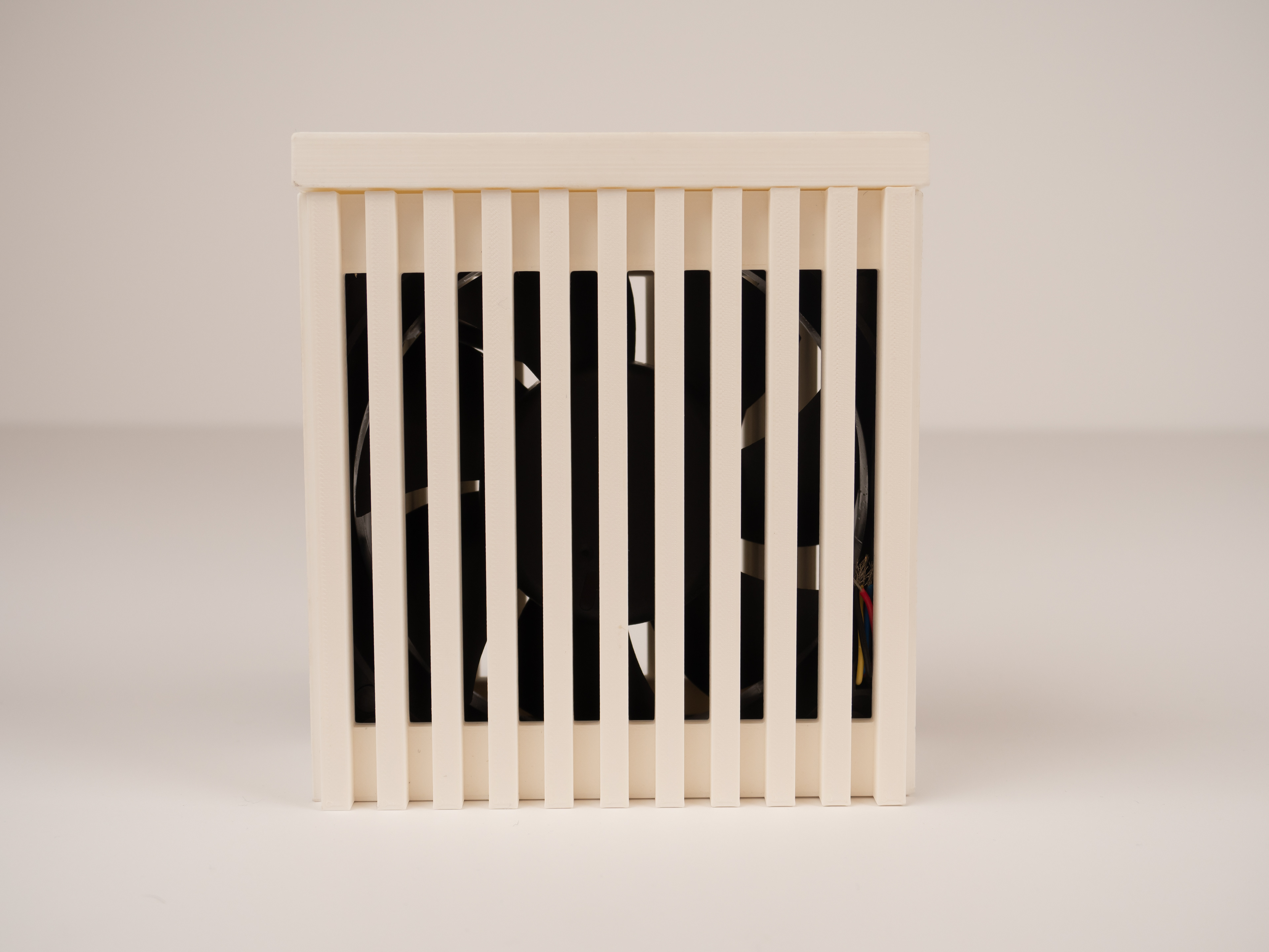 I created some 3D model explorations of a design that could be mounted as a wall shelf or placed as a standalone model on a surface, experimenting with different proportions to see which would look best aesthetically. I then designed and 3D printed a model to encase the PC fans we were using as modules for our prototypes.