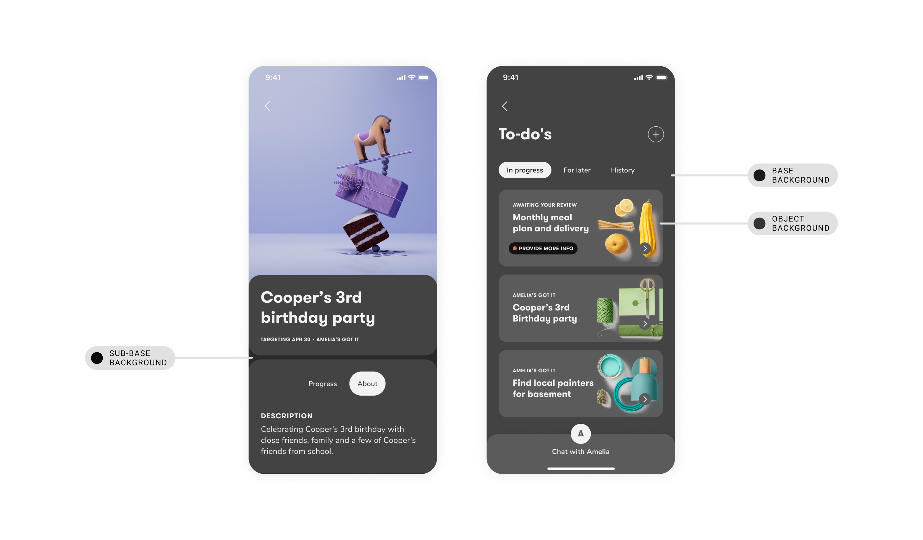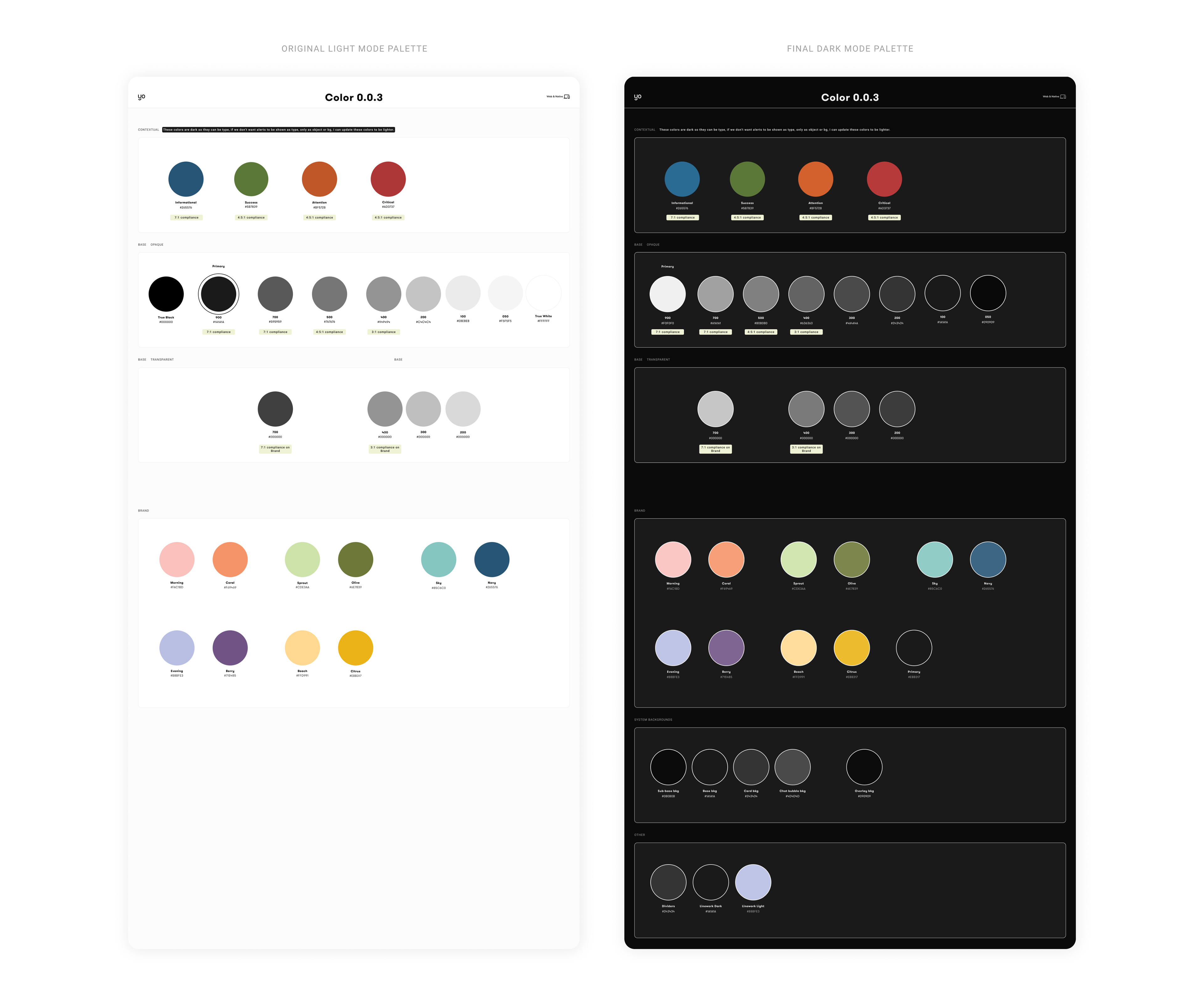 Original light mode color palette alongside the dark mode color palette I created, which included my recommended structural changes to be applied to both modes in order to enable 1:1 switching