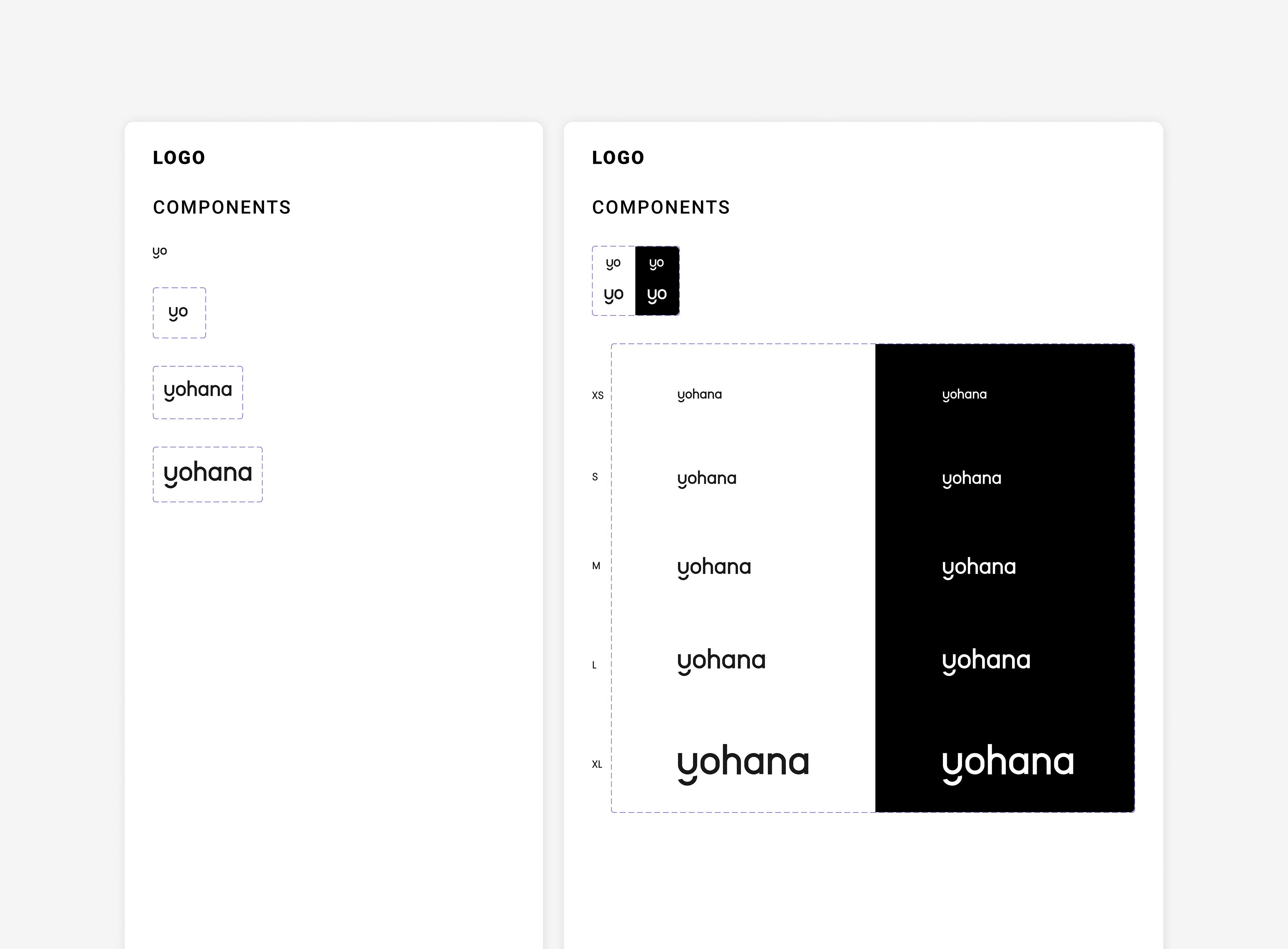 Our logo component before (left) and after (right) my standard sizing and light/dark mode work