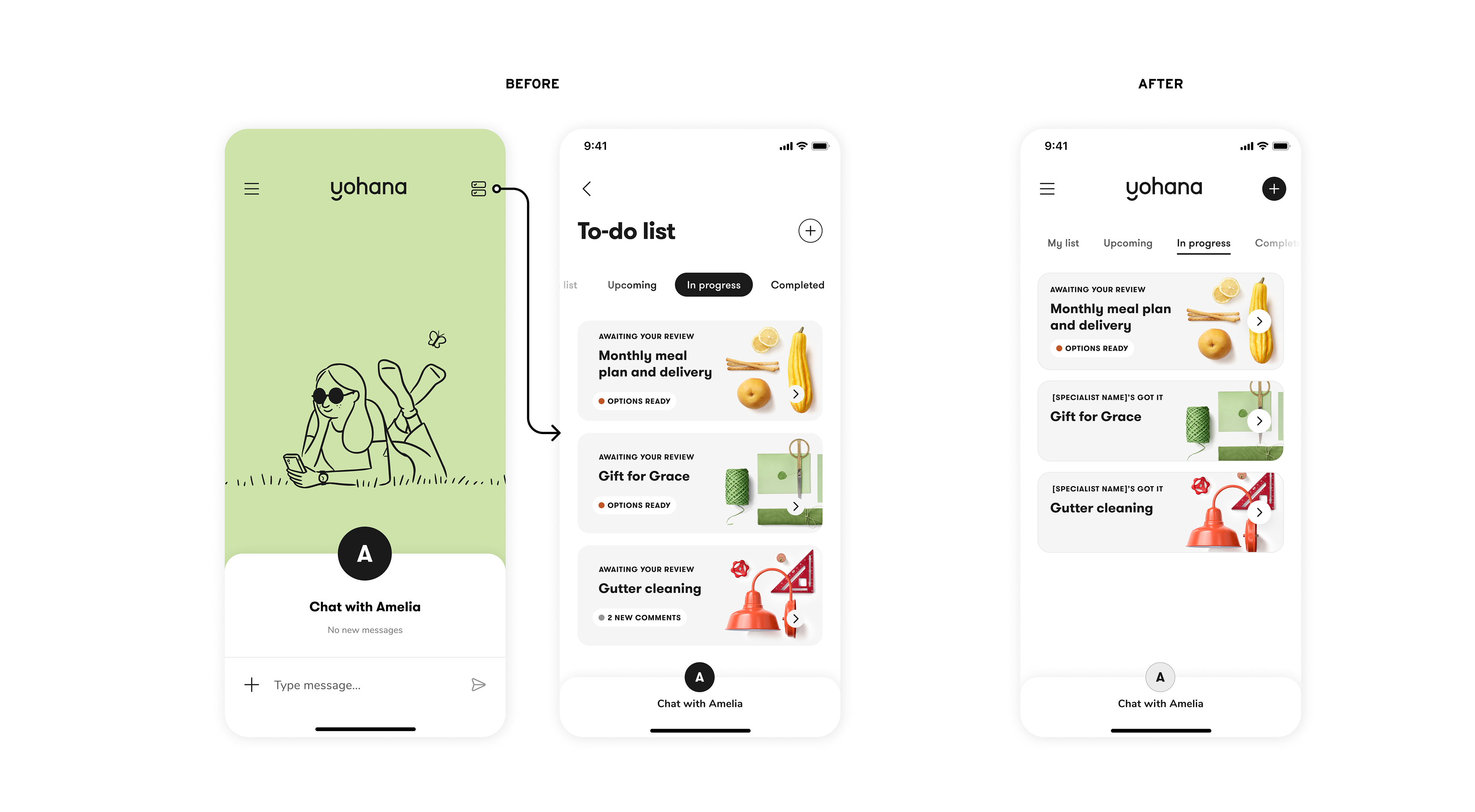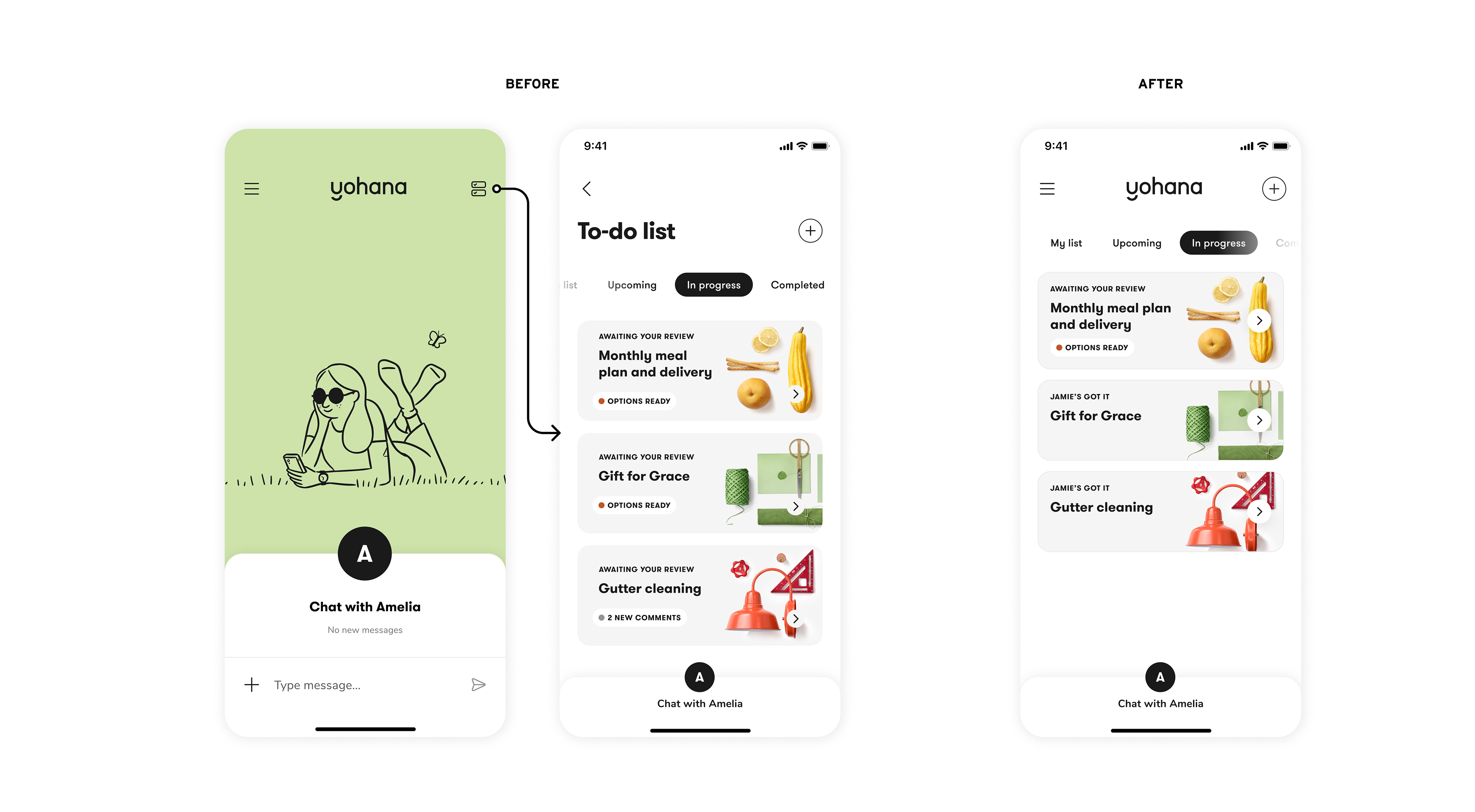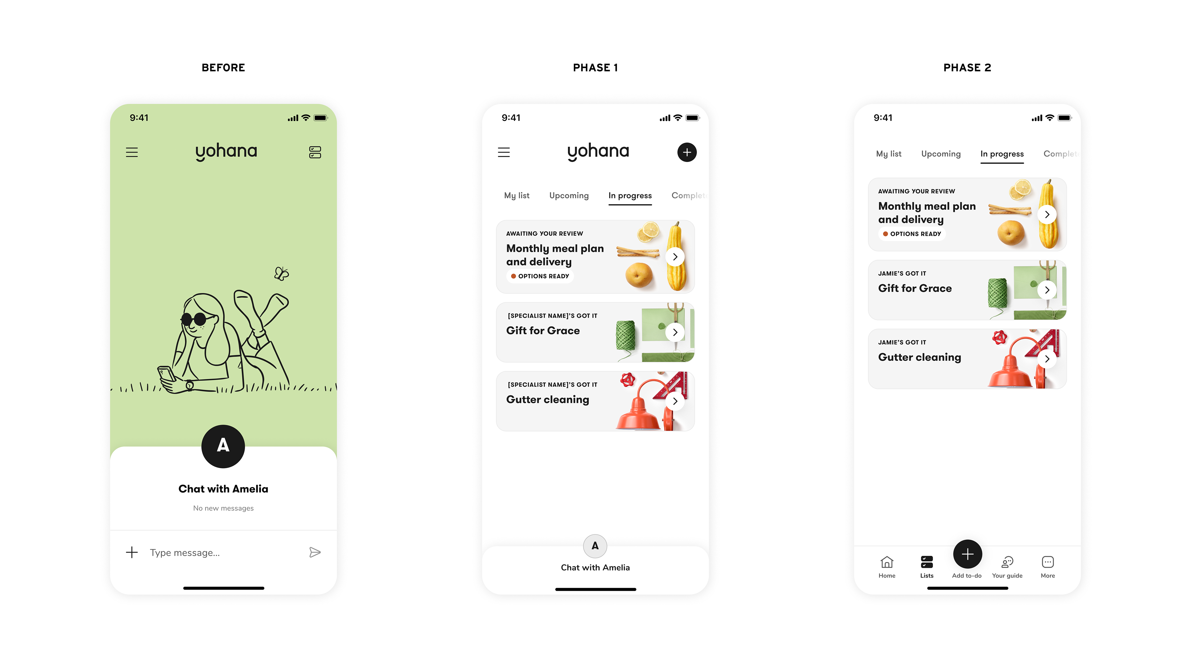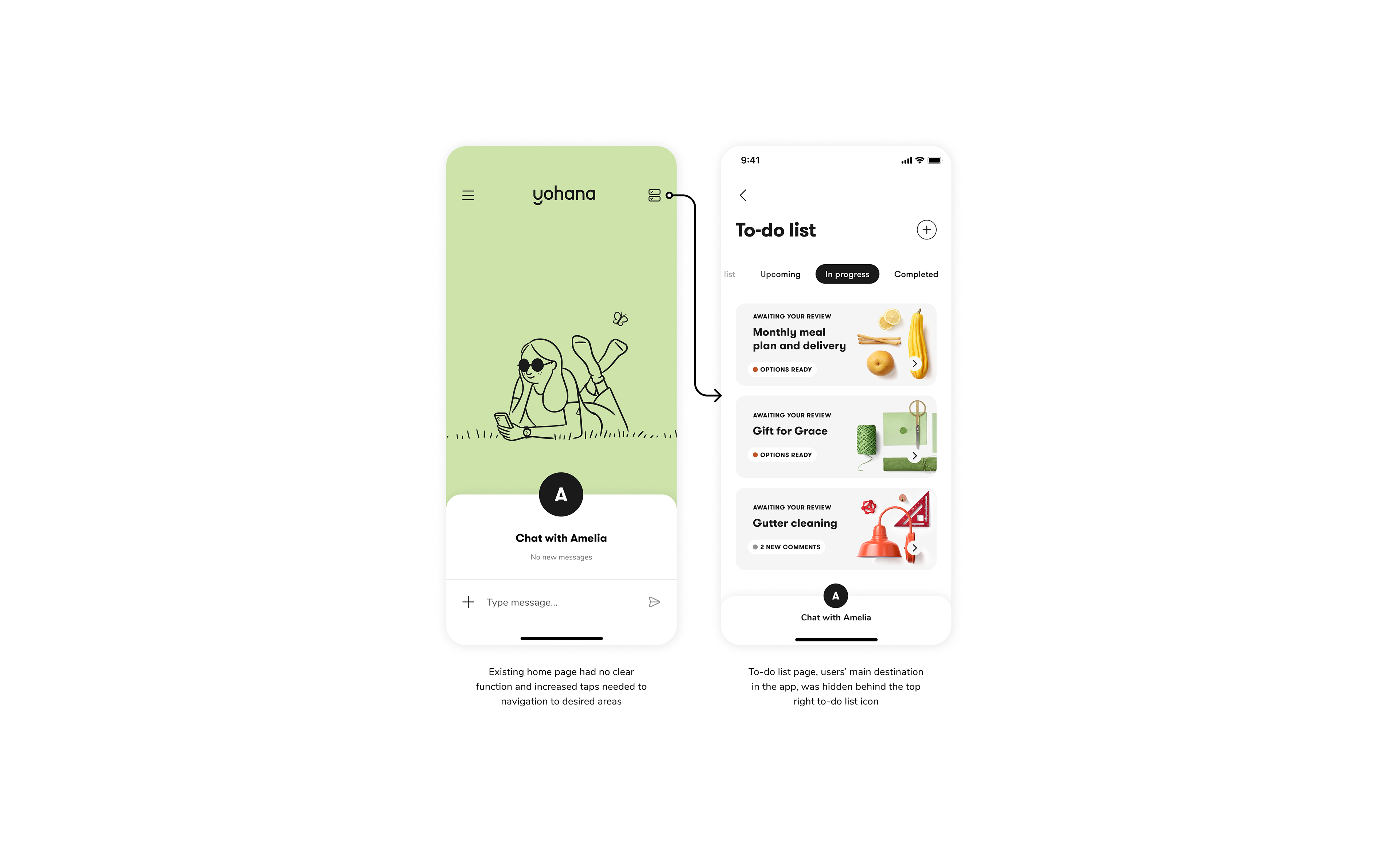For phase 1, we decided to remove the existing home page and make the to-do list the home page to eliminate unnecessary taps. We also minimized the chat entry point to make it secondary to the to-do list content.