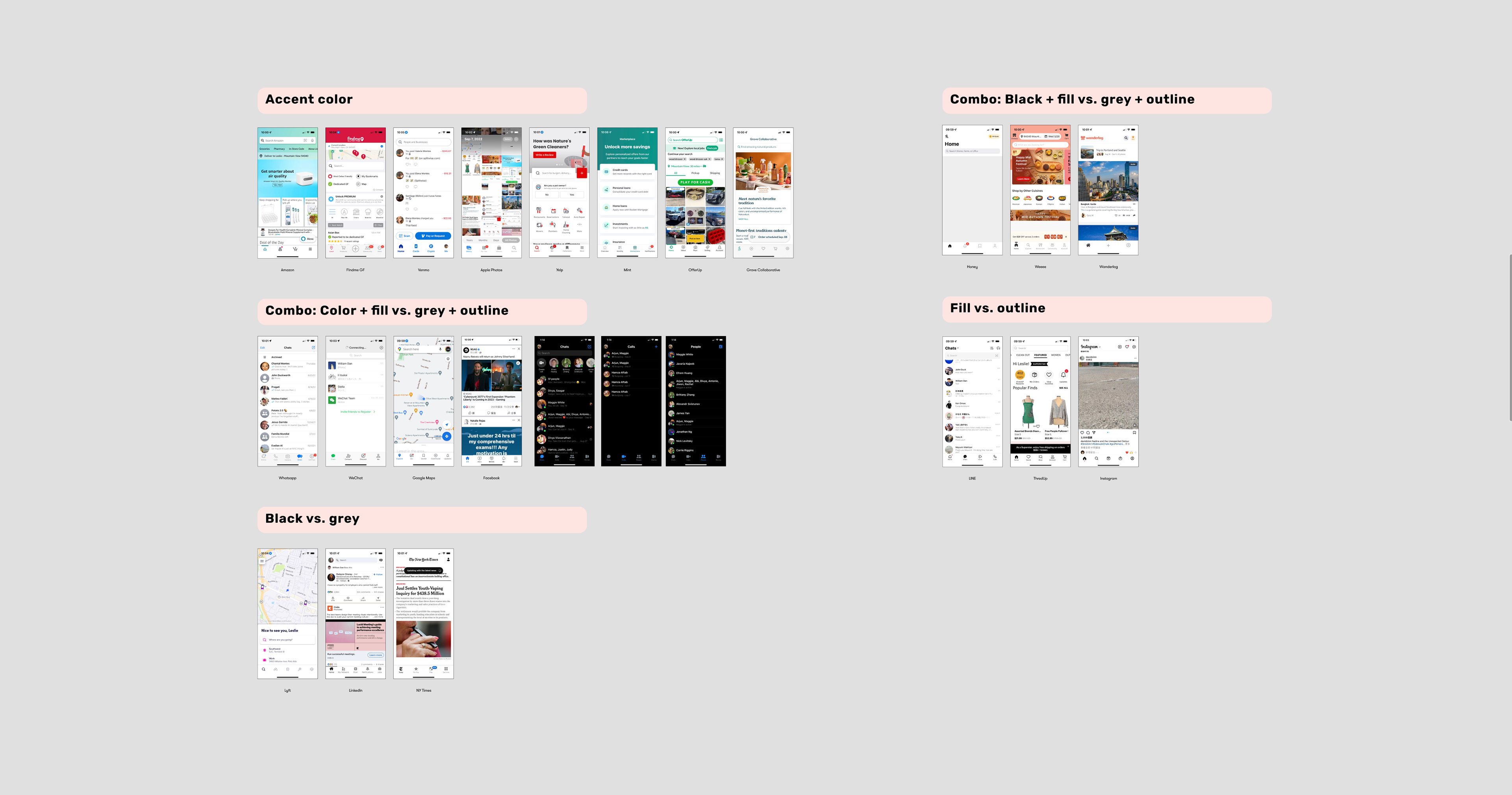 Along with determining the information architecture and which pages should go in the bottom navigation bar, I also set about tackling the visual design. I conducted an audit of popular apps and other apps that included a "+ button." In this audit I categorized different apps' bottom nav bars to show the different visual types and trends that we might want to choose from for our own app.