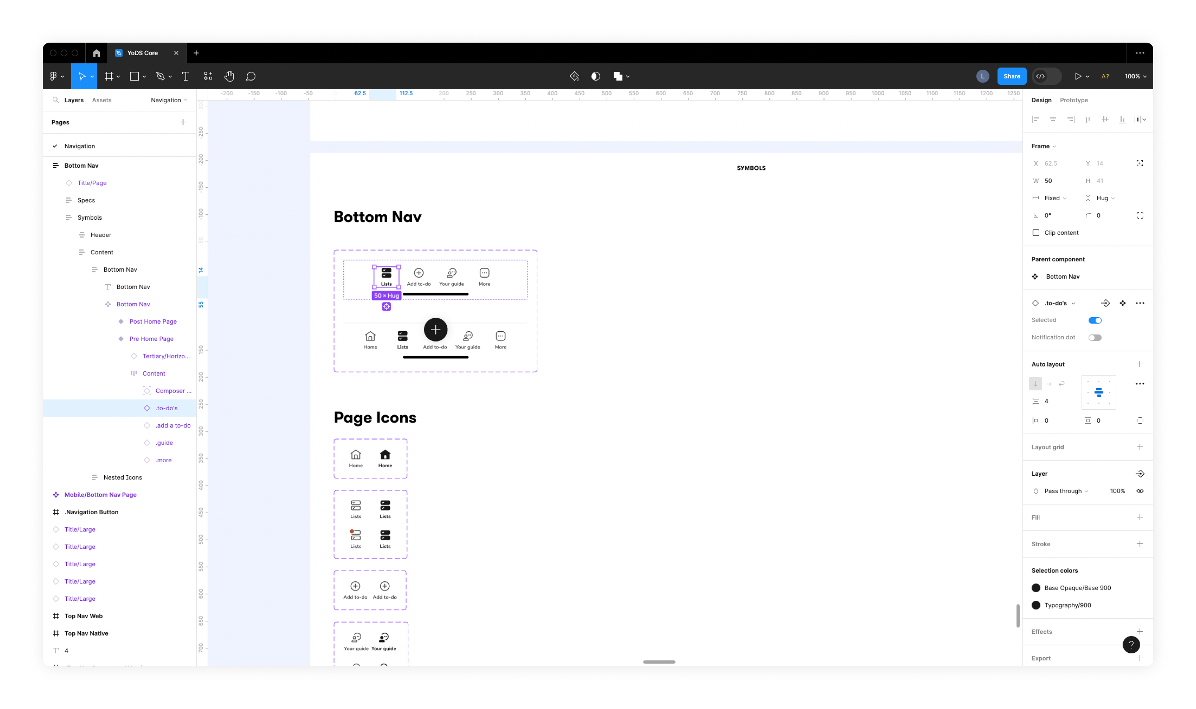 After completing the design of the bottom navigation bar, I created the design system component, making sure it was easy to update in case we wanted to change the pages included later on. I also added the necessary new icons to our icon library.